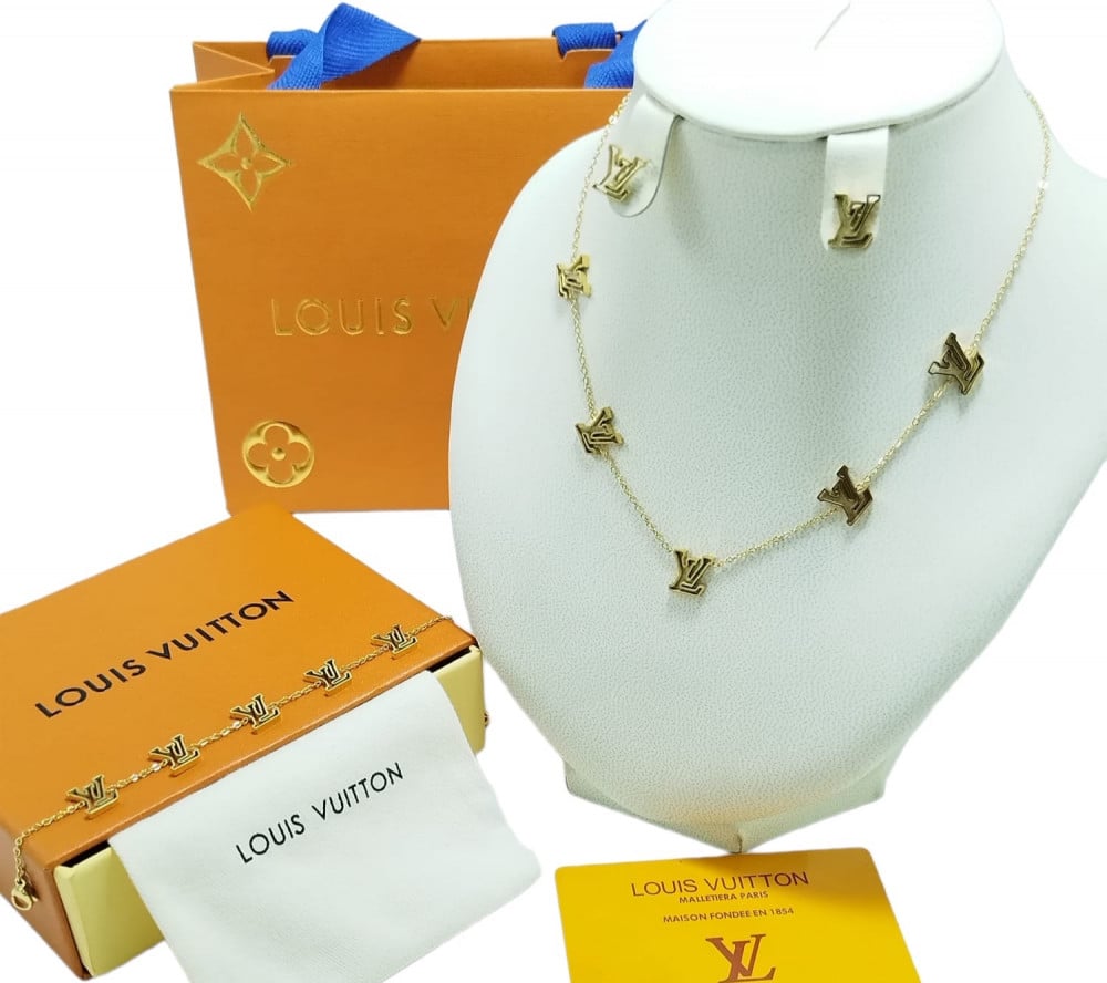 طقم لويس فيتونسلسال واسوارة وحلق ستانلس ستيلضمان سنة على اللون.مع جميع ملحقات الماركة ( كيس + علبة + كرت )
